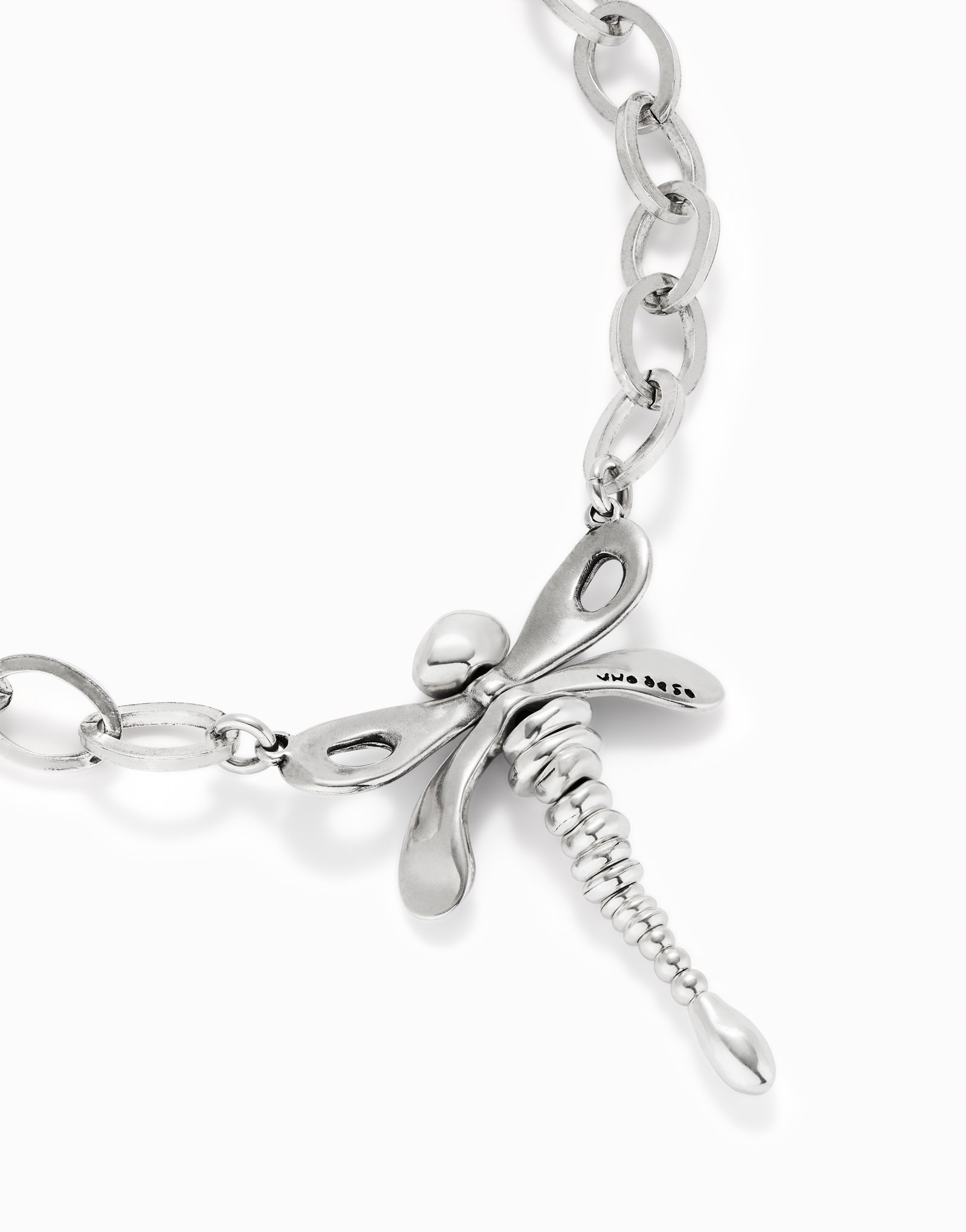 Collier chaîne plaqué argent avec de grands maillons et une libellule centrale. Élaboré en Espagne selon un procédé 100 % artisanal.Des pièces où la libellule devient le grand pari de la saison,
