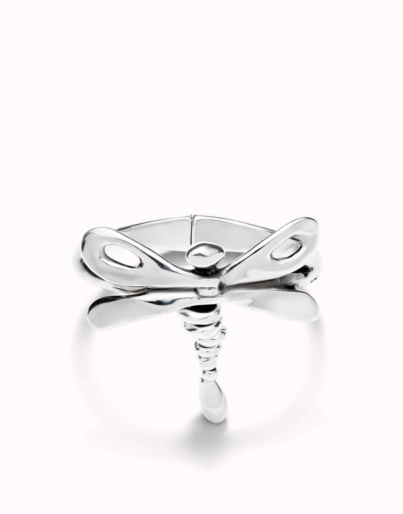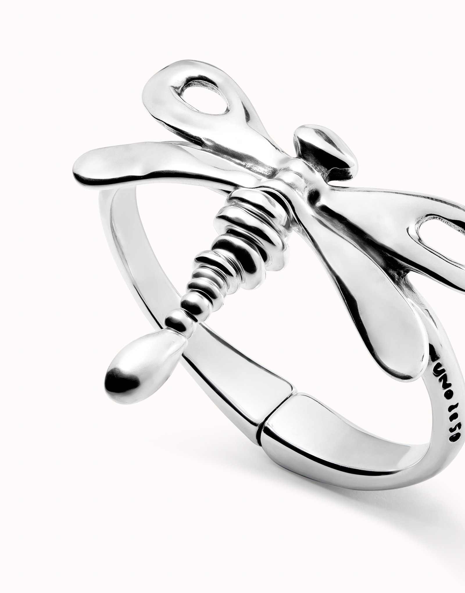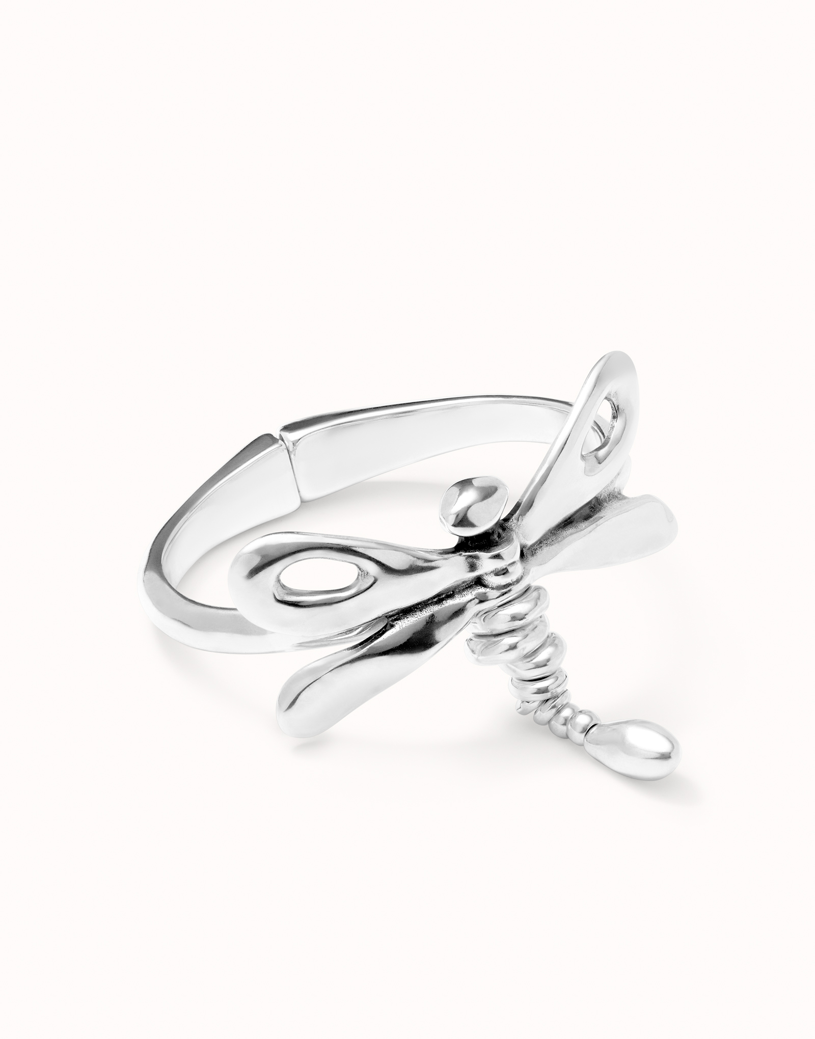 Bracciale rigido con libellula di grandi dimensioni placcato argento Sterling. Prodotto in Spagna con un processo artigianale al 100%.Su questi pezzi la libellula diventa la gran scommessa della stagione e li trasforma in