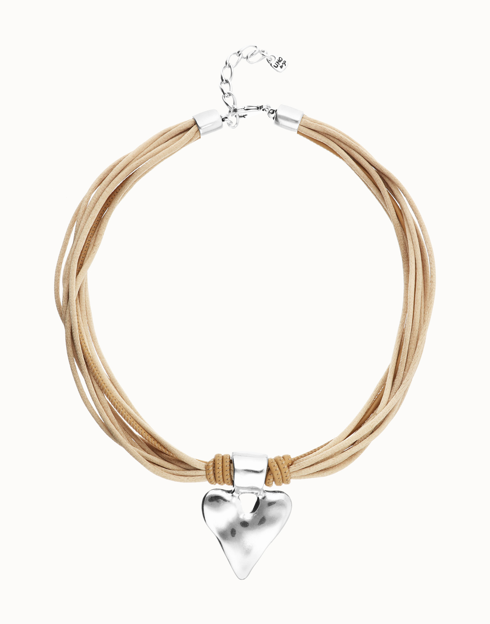 Camel leather and silk thread necklace with heart detail.When something inside you beats strongly, there is only one way to listen to it: let go. The Beat Collection is a celebration of letting go of the reins and letting your heart lead the way. A handmade heart, imperfect, but real. Because the result of living this way is a heart sculpted with your own hands.